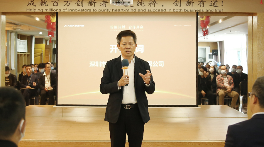 肖奋董事长致开幕词,他首先对各位嘉宾及供应商代表的到来表示热烈欢迎并对大家一直以来的支持致以真诚谢意。会上,他总结了公司近两年来的发展情况,尤其是2021年以来,面对新冠疫情、芯片短缺、大宗商品原材料价格剧烈波动等严峻挑战,整个行业都危机重重,然而PA视讯科技在供应商朋友们的互相支持下,一起携手奋进、共克时艰,使得经营收入保持了持续增长,在困难重重中取得了较好的成绩。