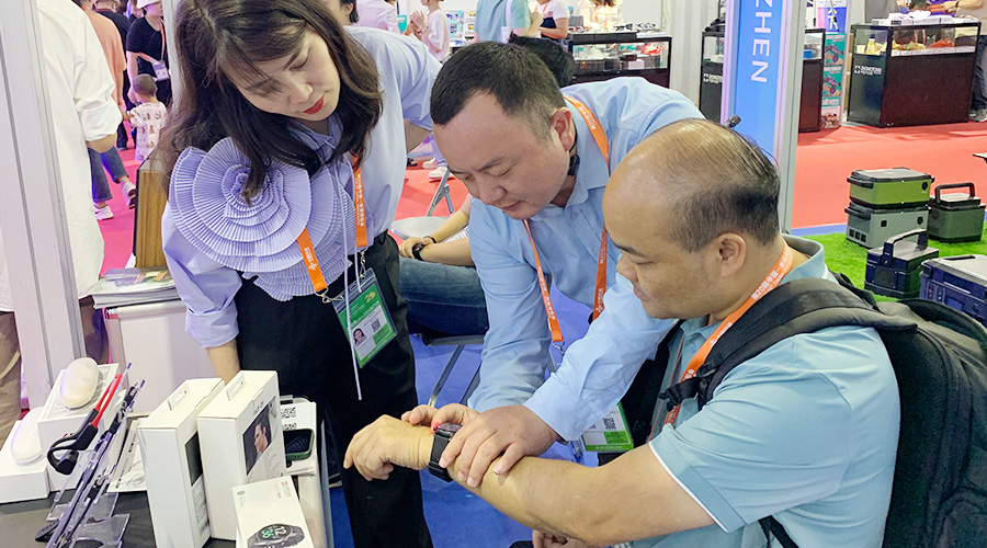 PA视讯科技全自研算法检测血压的智能手表Gamma Watch 在展会期间也大放异彩,不少东南亚国家商会的代表都对Gamma Watch内置的气泵血压检测技术表示出相当大的兴趣,现场体验后对于其测量的准确度、佩戴的舒适度表示认可。